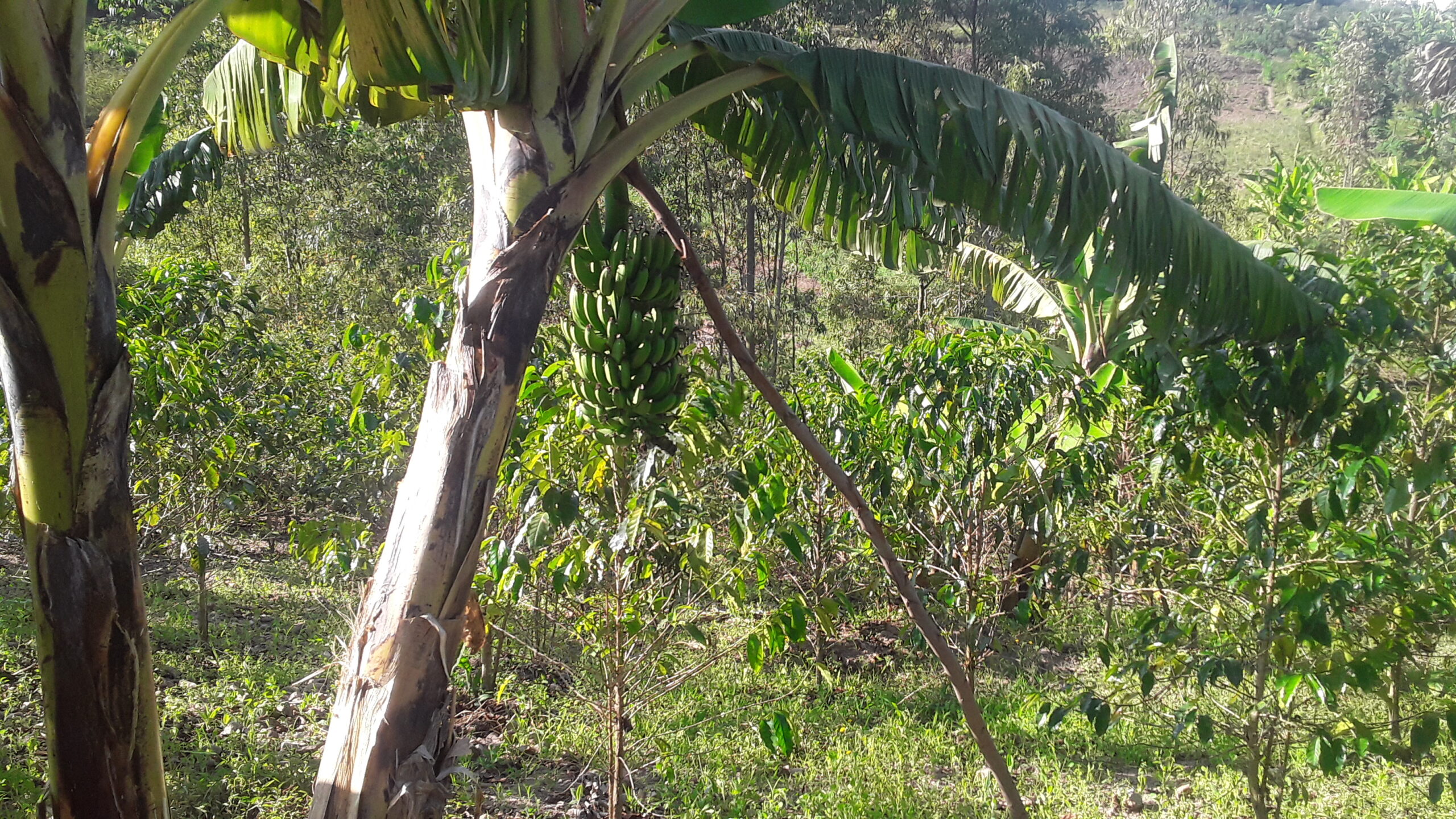 Banana trees provide shade on the coffee farm. They also bring additional income and are nutritious.