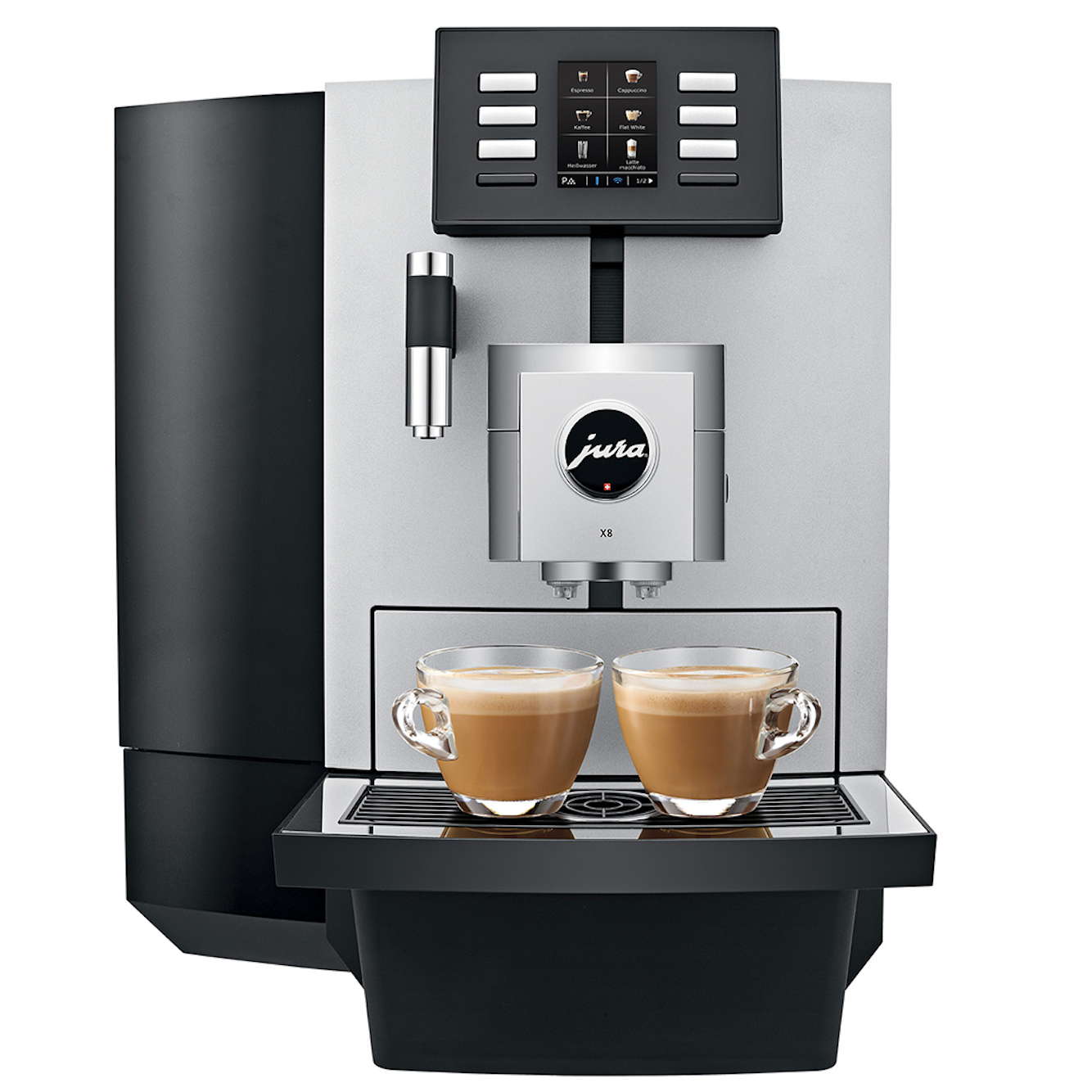 We can be short about that: a lot! With the Jura X8 you can make 2 of the same coffees at the same time. And as an extra you can also fill a jug of coffee. With this option the machine makes 5 cups of coffee at the same time. A nice extra, but we, as real coffee lovers, are not a real fan of this. Espresso coffee needs to be made directly in the glass.